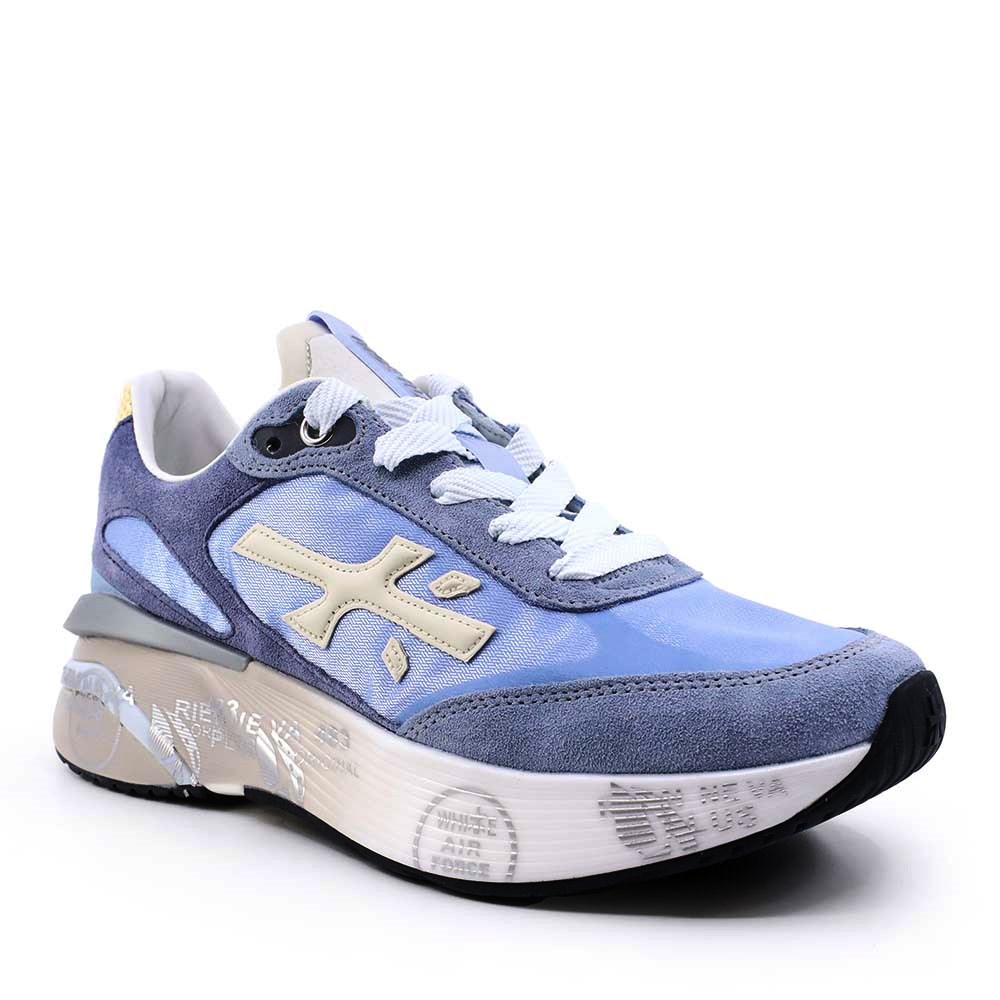 Sneakers Premiata Moerun-D, realizați din piele întoarsă și material textil, oferă un echilibru excelent între flexibilitate și rezistență. Combinația cromatică albastru cu accente bej conferă un aspect modern, ușor de integrat în ținute sport sau casual.