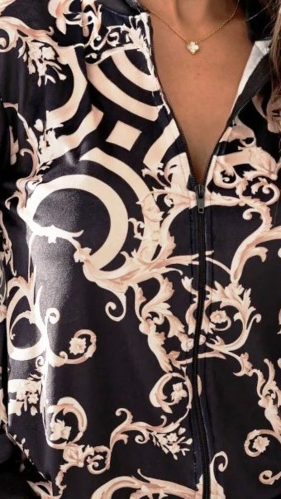 Treningul damă negru din catifea cu imprimeu baroc bej este un exemplu perfect de îmbinare între moda sport feminin și eleganța subtilă. Acest trening elegant de damă transformă instant o ținută casual într-un look sofisticat. Bluza cu fermoar și mâneci lungi prezintă un imprimeu baroc în nuanțe bej, creând un contrast modern și atrăgător! Pantalonii din catifea cu talie elastică și croială confortabilă asigură libertate de mișcare! Dar și potrivire ideală pentru activități zilnice sau momente de relaxare. Materialul moale, compus din 95% poliester și 5% elastan, oferă senzație plăcută la purtare, combinând confortul cu un aspect rafinat.